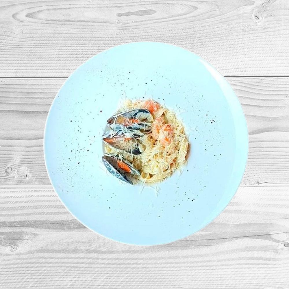 Фетучини, морепродукты, сливки, пармезан, соус песто.
