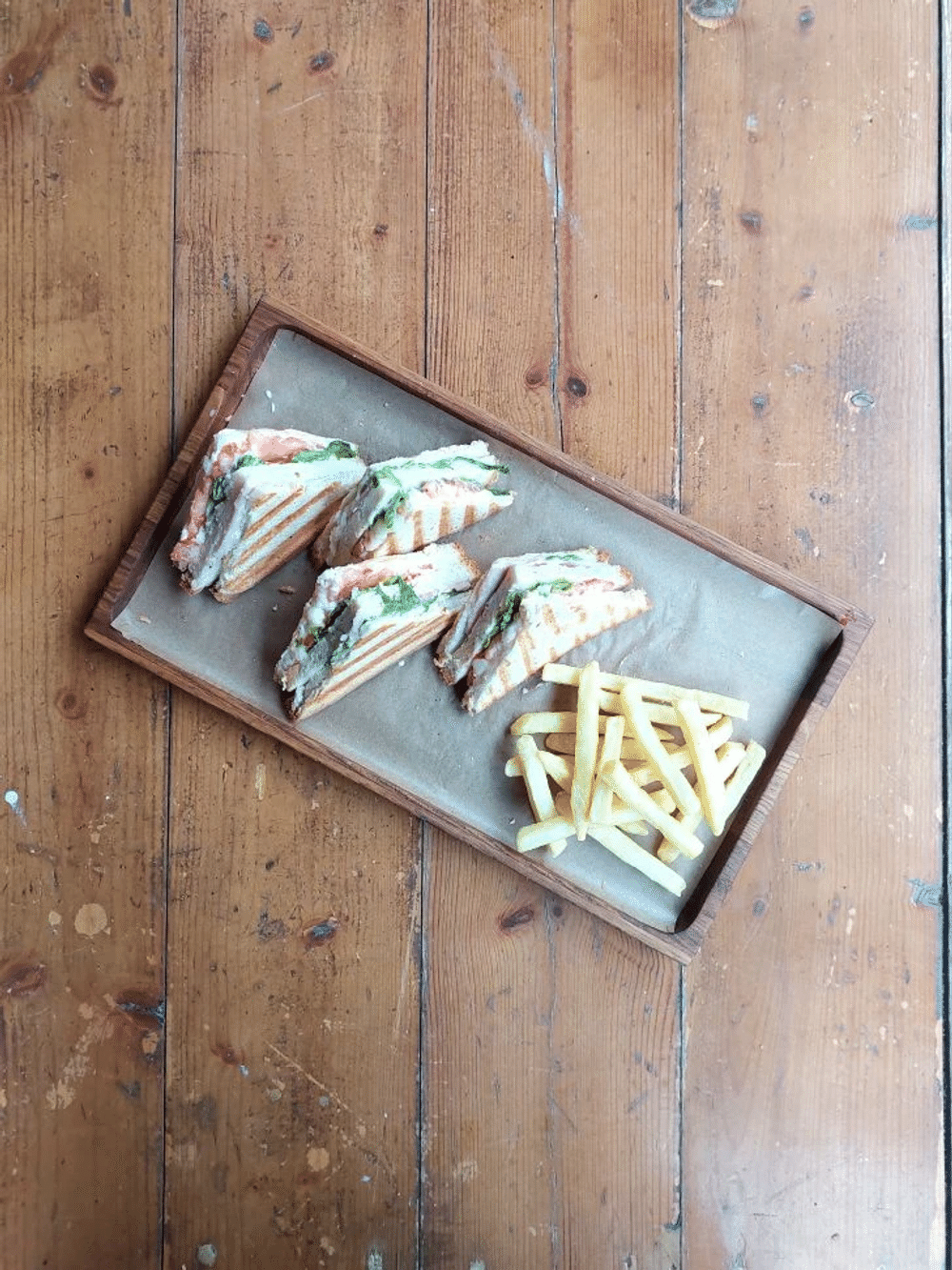 Хлеб для сэндвичей, ветчина, томат, лист салата, соус, сыр, картофель фри.