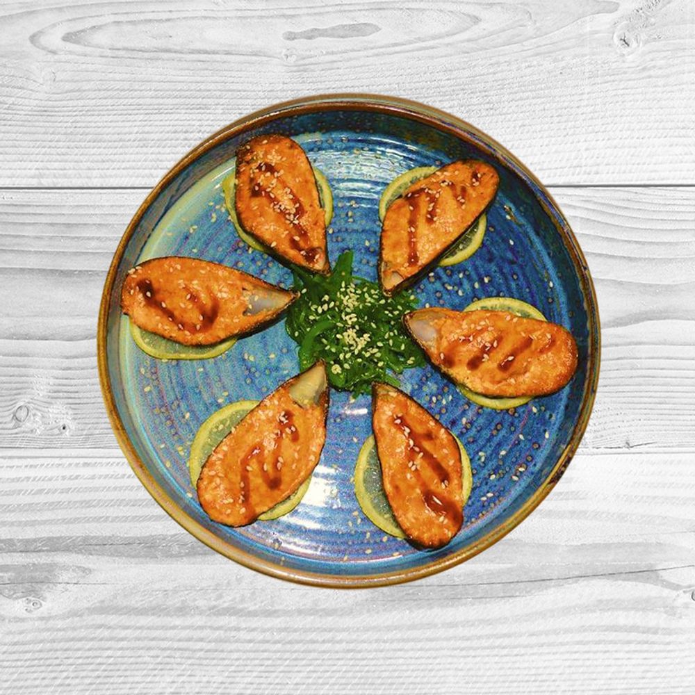 Запеченные мидии в остром соусе. Подаются с лимоном и чукой.
