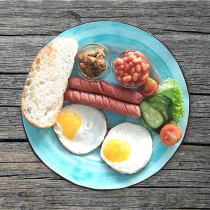 Два куриных яйца с беконом, пармезаном и зеленью.