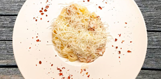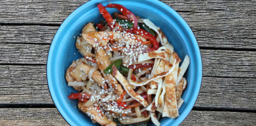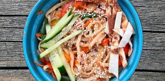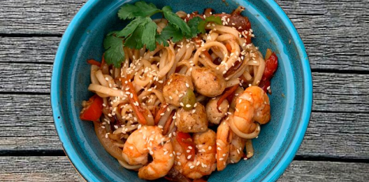 Японская лапша с овощами, бекон, креветки тигровые, огурчик свежий, кунжут, соусы.