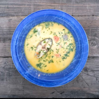 На курином бульоне с фрикадельками из грудки, с зажаркой из лука и моркови.
