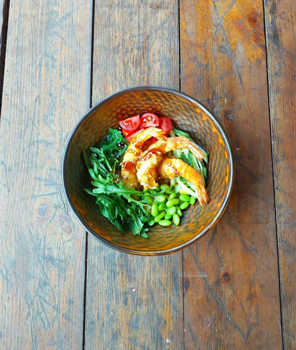 Тигровые креветки в темпуре, подаются на булгуре с помидорками черри, свежими огурчиками, болгарским перцем,бобами эдамамэ и зелеными листьями под соусом.
