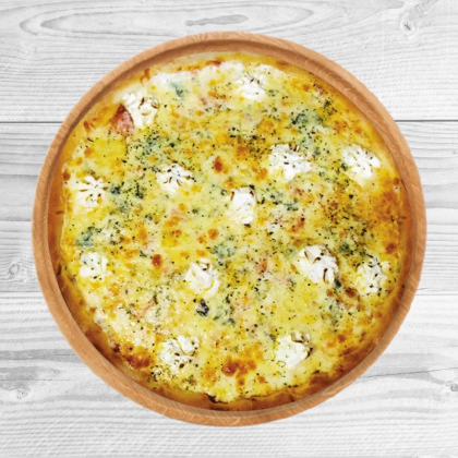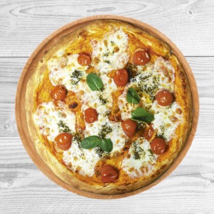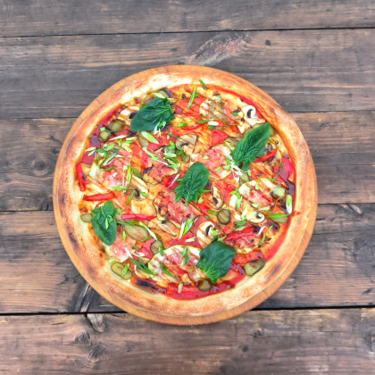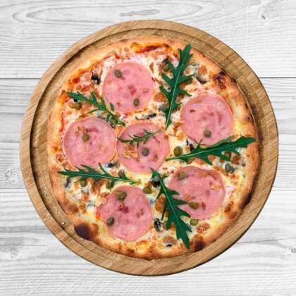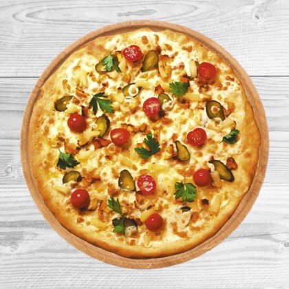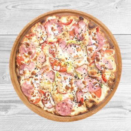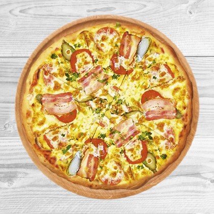 Фирменное тесто, бекон, огурец маринованный, лук красный, соус, моцарелла.