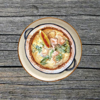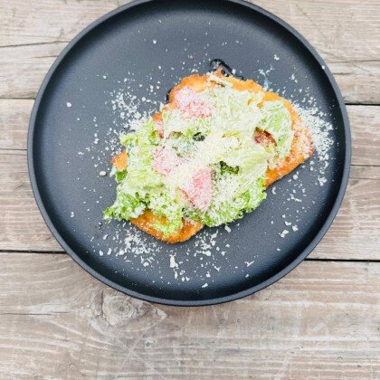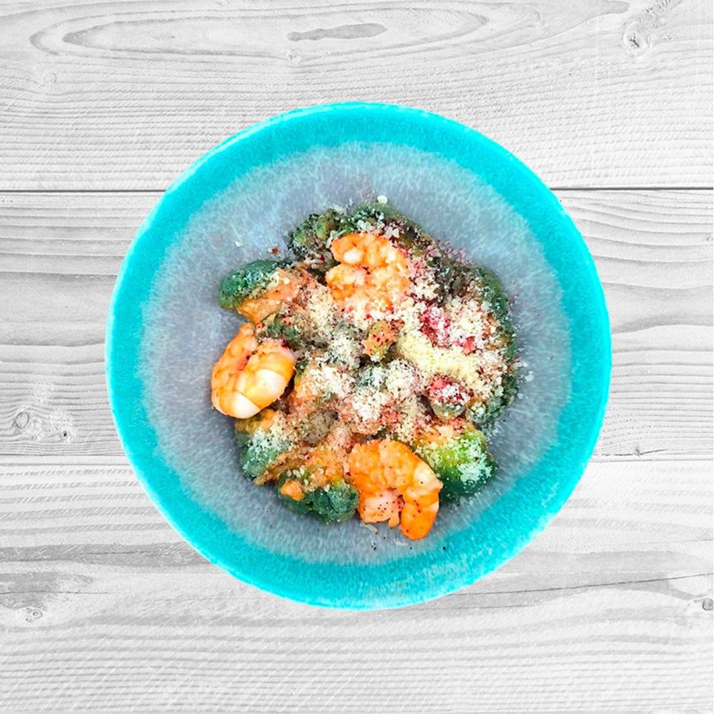 Брокколи, тигровые креветки, фирменный соус, пармезан.