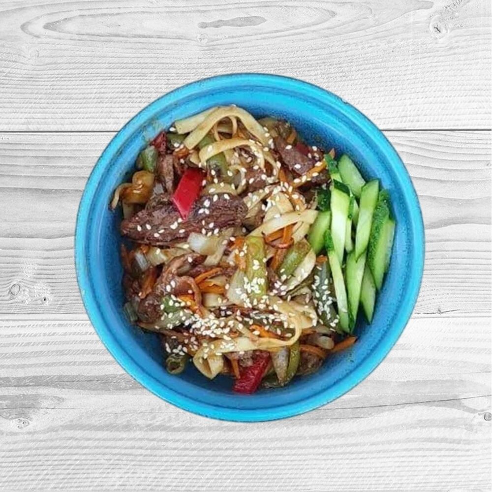 Японская лапша с овощами, кусочки говядины, овощи, соус, кунжут, огурчик свежий.