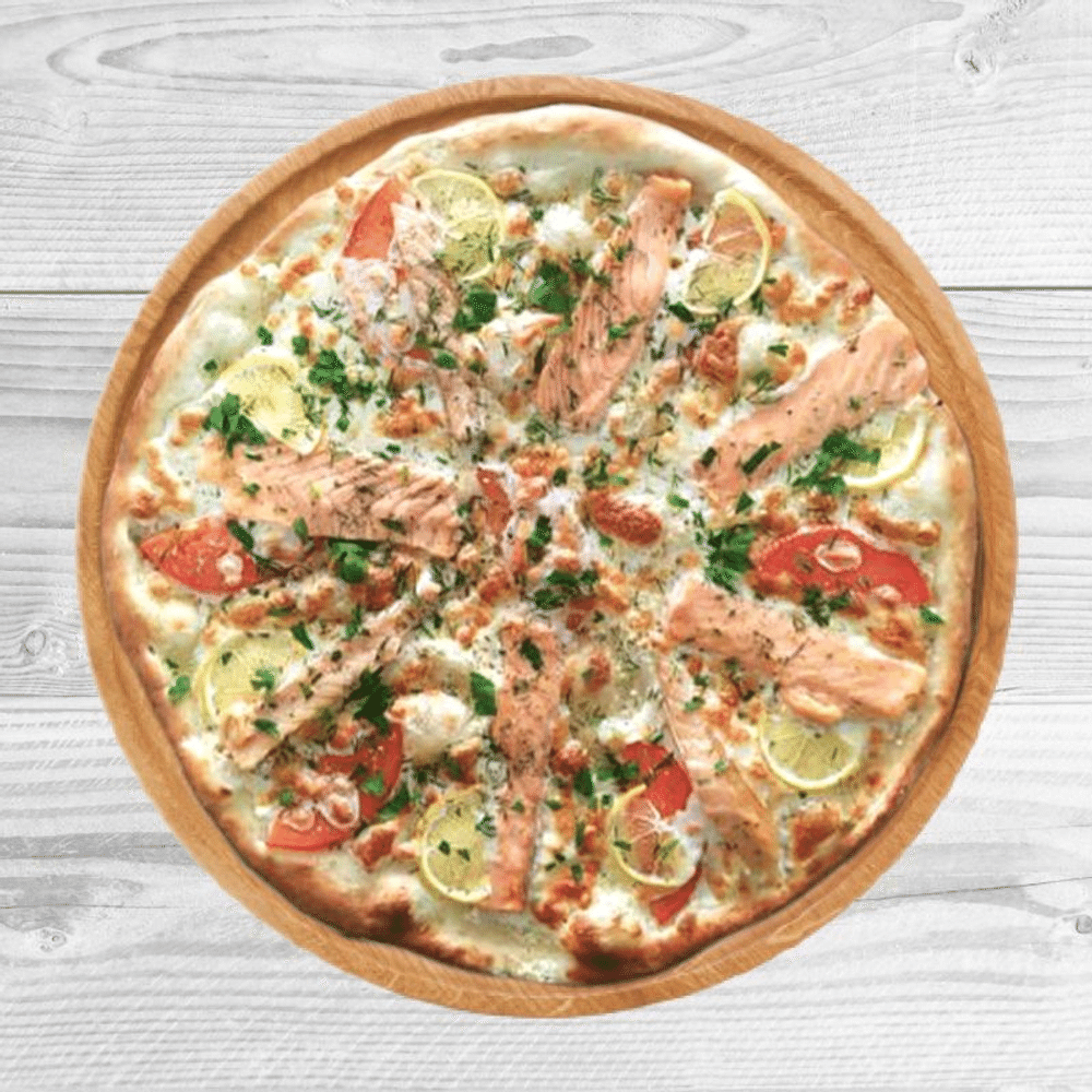 Фирменное тесто, лосось, лимон, моцарелла, томат, оливки, белый соус.