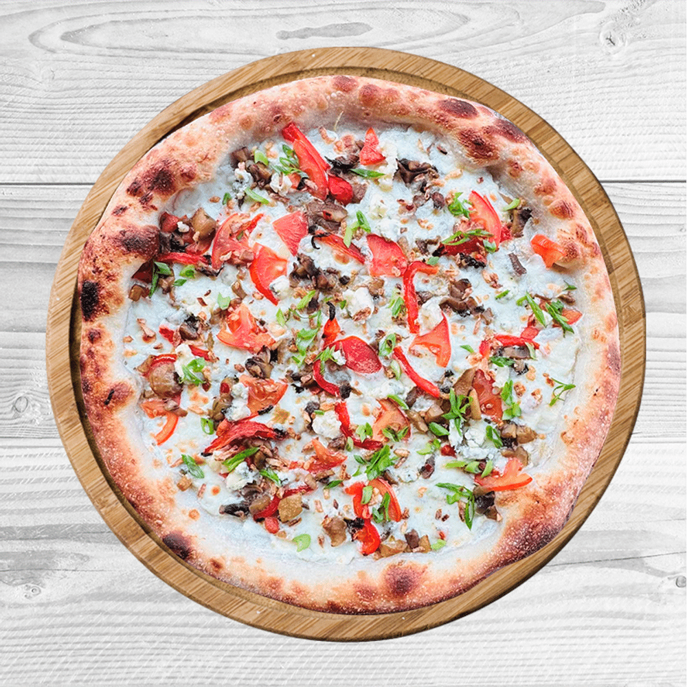 Фирменное тесто, пепперони, белые грибы,шампиньоны, томат черри, перц болгарский, моцарелла.