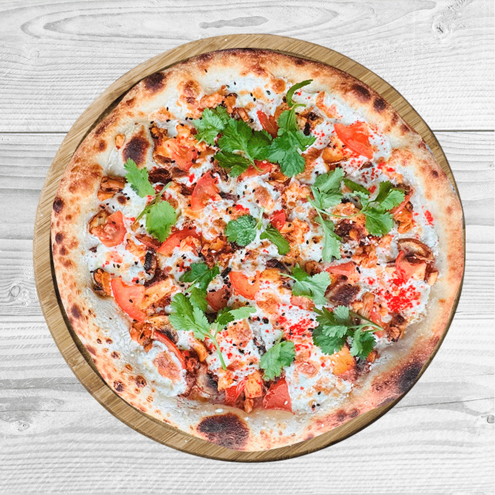 Фирменное тесто,соус том ям, курица, грибы, морепродукты,томат, моцарелла,кинза.