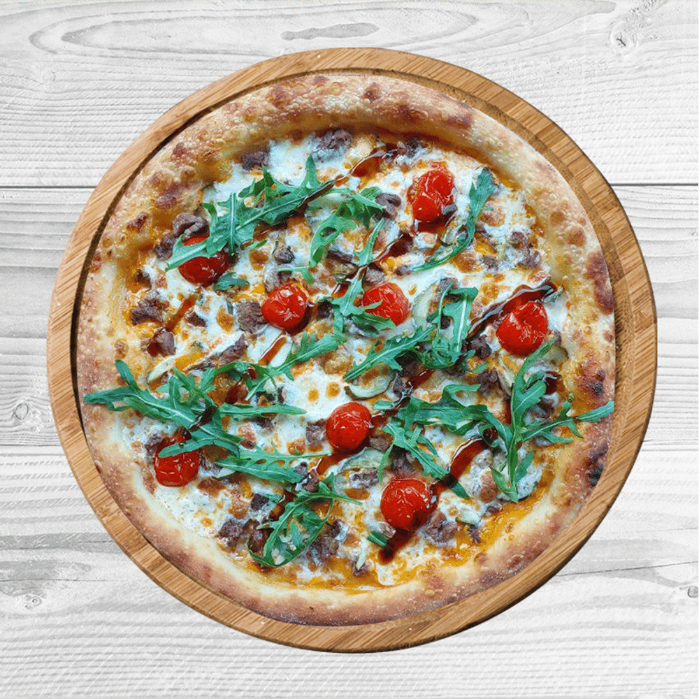 Фирменное тесто,говядина запеченная, огурец маринованный, перчик маринованый,томат черри, руккола, лук красный,моцарелла.